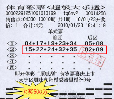 据悉,大乐透10010期南京的中奖者出手相当的豪迈,中奖票是一张“18+2”1.7万元的超级复式票。再看看我们这位“小广东”的中奖票只有区区4元,两注单式票,而第2注号码“15 22 24 32 35+02