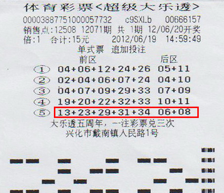 丁先生告诉记者,他是体彩的老彩民,很早以前就开始买7位数,大乐透上市之后,他又喜欢上了这种玩法。虽然彩龄很长,但是丁先生买彩票和2.56亿元得主一样,也是抱着很随兴的态度。一直以来,不管是购买7位数还是大乐透,丁先生从来没有自选过号码,全都是随机选号。6月19日下午,丁先生在12508站点随机购买了5注大乐透,并进行了追加投注,第二天晚上,12071期大乐透开出了“13-23-29-31-34+06-08”的中奖号码,这正与丁先生所购买的第5注号码一致,超值的追加投注为丁先生带来了1138万元的总奖金。