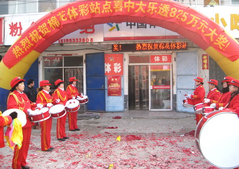 笔者一早就来到了中奖站点,离站点还有些距离,就已经感受到了这里的欢乐气氛。横幅、拱门、鞭炮,一个都不少,还有本地的艺术团队也赶来捧场,好似过年一样。据销售员介绍,中奖者应该是位年轻的小伙子,大概三十岁左右,喜欢大乐透和顶呱刮,每次购买彩票不超过10元。1月26日晚,他买了两注大乐透,一注追加,一注没追加,就是其中的一注中了大奖。具体的中奖故事,我们只能等待这位幸运儿到省体彩中心领奖后,方能知晓。