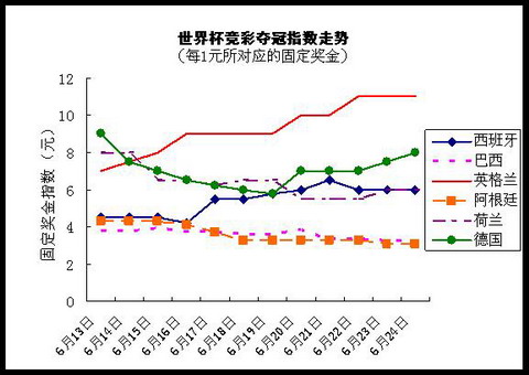 近期夺冠指数又有新的变化,首先变化最大的是英格兰,夺冠指数从6.0上升至11.00,逼近一倍,西班牙,德国也同样略有涨幅,不过,阿根廷、巴西夺冠指数略有下降,建议看好阿根廷和巴西的朋友应该抓紧购买。