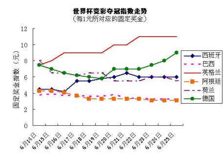 近几日夺冠指数变化较大,首先变化最大的是英格兰,夺冠指数从6.0上升至11.00,逼近一倍,德国近四日也一直在增长,不过,阿根廷、巴西、荷兰夺冠指数略有下降,成为夺冠的三支热门球队,建议看好阿根廷、巴西、荷兰的朋友应该抓紧购买。