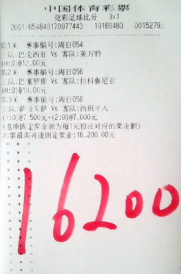常州一彩民投注竞彩“比分”玩法 20元中得1万6