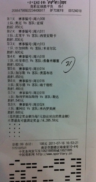 从中奖票上可以看出,这位“状元”选择了德国乙级联赛、瑞典超级联赛、挪威超级联赛和巴西甲级联赛的8场比赛,并采用了单式投注。他解释说:“在竞彩玩法上我也算是个老彩民了,这次8串1开售,自然要试试。最近女足世界杯和美洲杯的比赛我都关注了,可是几只传统强队都很不给力,这次尝鲜8串1,就放弃了这些热门赛事,选择了更加稳妥的小联赛。”