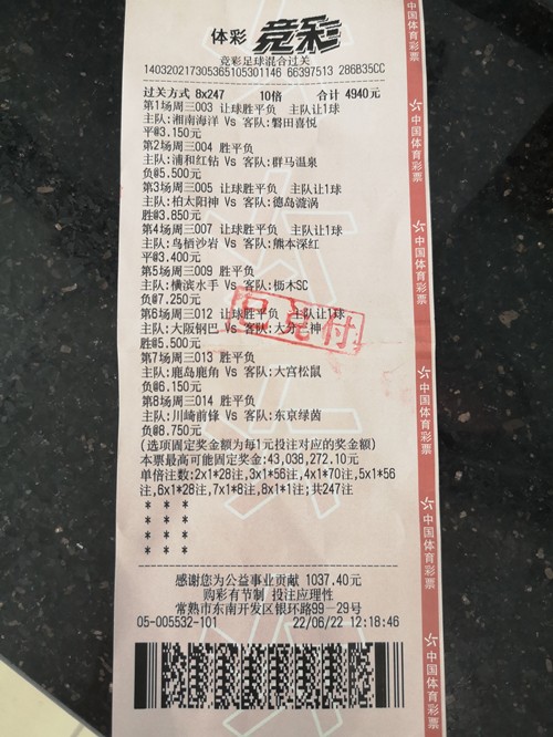 6月22日,常熟市东南开发区银环路99-29号的3205005532体彩销售网点中出竞彩足球混合过关奖金29万余元。6月23日下午,中奖者来到常熟市体彩中心兑奖,据了解,此次中奖的何先生是位资深球迷,平时的爱好就是看球赛,特别喜欢关注五大联赛,尤其是对英超。由于近期比赛冷门较多,例如日本足球天皇杯,所以虽然何先生平日一直是“2串1”投注,但这次为防止爆出冷门,他根据过往经验,冷静分析比赛,有选择性的采用了8X247 倍投这一方式,一举斩获奖金298438.60元。
