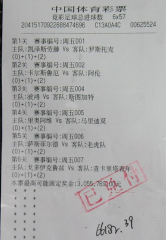 湖滨街02394网点连续10天中出大奖,在竞彩网点中名声响当当。4月26日,徐先生又带来两张竞彩中奖彩票,从这两张彩票可以看出投注人在做投注单时是很大胆的,两张彩票都选择了6场比赛,采用了竞彩游戏最新推出的M串N的投注方式,一张是4月23日周五的竞彩足球总进球数的玩法,投注人不仅选择了6×57的投注而且对每场比赛还进行了复式投注;另一张投注的是竞彩足球胜平负玩法,投注方式与前一张相同。幸运的是在进行复式投注的情况下,两张彩票6关全中,每张各中57注,奖金分别为66182.39元和20323.94元。