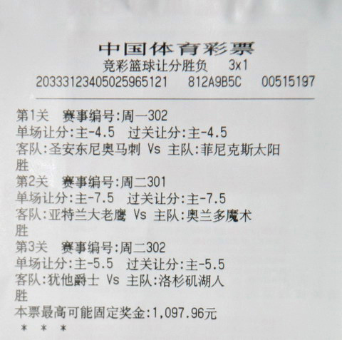 果然,半个小时之后张先生带着中奖彩票来到了体彩中心,一看中奖彩票,跟上次的17万大奖风格一样,也是2串1、3串1的竞彩篮球让分胜负玩法。我们不禁好奇的想知道,这是否又是那位竞彩超人的杰作。可是张先生却跟我们卖起了小关子:“现在我们店里玩竞彩的彩民非常多,高手也不少,通过低关倍投中大奖的彩民可不在少数了。对我们来说,研究如何提高彩民的中奖率,让他们充分享受竞彩的快乐才是关键,这也才能体现竞彩因智慧而快乐的理念。”虽然没有得到中奖者的信息,但张先生的话却告诉了我们他的竞彩店吸引众多彩民及具有较高中奖率的关键所在,这也是所有竞彩店的共识。