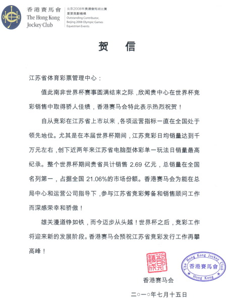 我省竞彩世界杯期间销售喜人 香港马会发来贺信