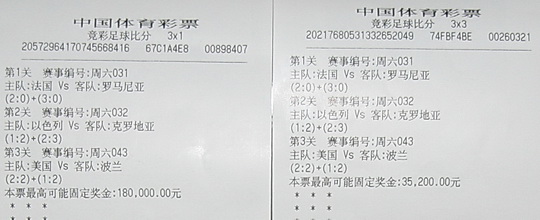 冯先生也是一位竞彩投注经验丰富的彩民,本次他选定了“法国VS罗马尼亚、以色列VS、克罗地亚和美国VS波兰”三场比赛,并对三场比赛的比分各选择了两个结果进行复式投注,他首先采用3串1的方式投注了20倍;随后,冯先生又对该投注赛事采用3串3的方式投注20倍。幸运的是三场比赛结果冯先生全部命中,3串1的彩票收获31680元,3串3的彩票收获11480元,总奖金为43160元。