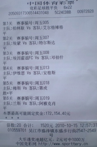 10月15日,吴江盛泽镇中心大道2349号的05597竞彩店的一彩民以M串N方式投注足球胜平负,用6串22的投注方式中得131767元的奖金。我们从中奖者沈先生(化姓)口中得知,他早就是05597竞彩店的老顾客了,自开业以来就一直在该店进行投注,每天都不落。