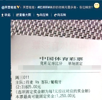 芙蓉姐姐预测的是北京时间6月14日凌晨丹麦对葡萄牙一战的比分,竞彩编号“周三011”,芙蓉姐姐出手不凡,她猜中了本场比赛“2比3”的最终比分,赢得了25倍的竞彩固定奖金,中奖达到1250元!此前芙蓉姐姐表示,她是因为邵佳一不再预测欧洲杯,自己才开始预测的。结果一出手就猜中了难度颇大的单关比分,而且还是单选2比3!实在令人刮目相看!想不到,芙蓉姐姐玩竞彩还真有一手! 另外,芙蓉姐姐此前还在微博上预测了6月14日凌晨两场比赛的胜平负结果,她的预测是“葡萄牙胜丹麦,德国不输荷兰”,结果两场都命中。