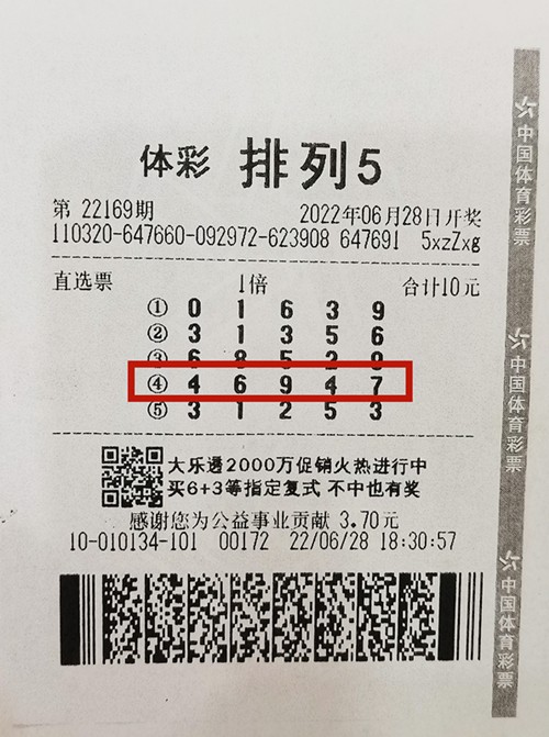 6月28日,体彩排列5第22169期开奖号码为:4、6、9、4、7,扬州3210010134网点传来喜讯,该网点一购彩者凭一张机选5注10元的票喜揽排列5奖金10万元。