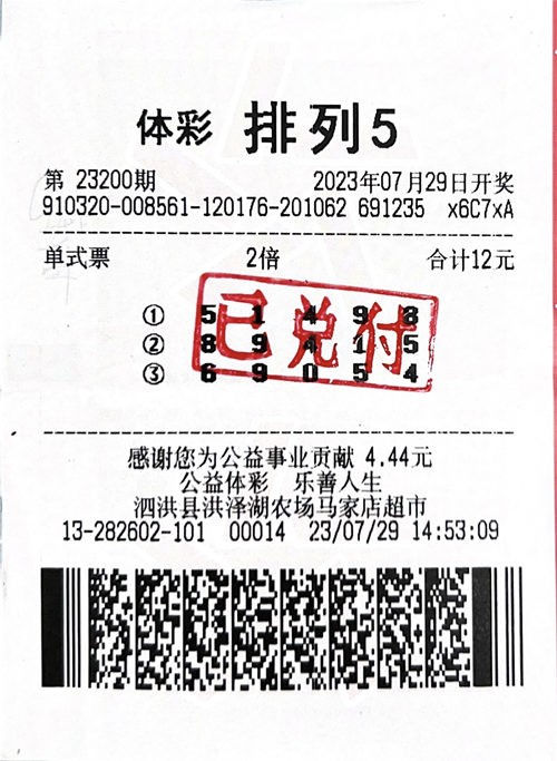 7月29日,体彩排列5第23200期开奖,开奖号码为“51498”,宿迁泗洪县洪泽农场的3213282602体彩实体店传来喜讯,一位购彩者喜中“排列5”一等奖3注,收获奖金30万元。