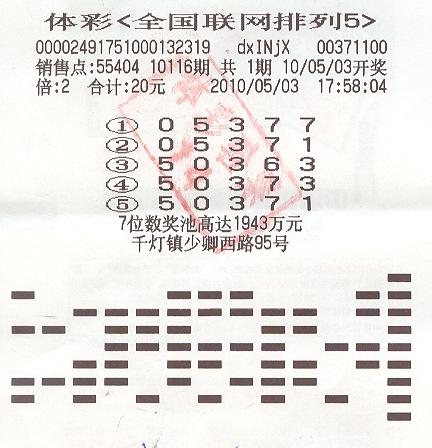 10116期“排列5”昆山独揽3注大奖,奖金30万元。昆山55404销售站和55470销售站分享了这三注大奖。