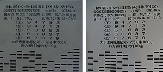 体彩“排列5”第10282期10月16日晚开奖,南京四方新村六村1幢109室的01005站点中出2注10万大奖。在人们猜测是否又是一个人倍投揽获大奖的时候,一位彩民前来体彩中心兑走10万元,这不经让大家产生疑问:另外的10万元又是哪位高人揽获的呢?