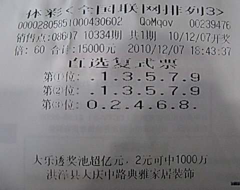 虽然之前经常中奖,但是彩民小李(化名)还是有点抑制不住内心的激动,他说自己平常除了上班,闲暇时间就在研究排列3,而且越研究越有感觉。7日那天,小李和朋友一起来到位于淮安市盱眙县大庆中路典雅家居装饰,想用之前中得的奖金把家里的房子重新装修一遍,在挑选完装饰品后,小李看见旁边的08607体彩站点,于是就过去继续购买自己钟情的体彩排列三。他让销售员打了60倍的“奇奇偶”直选复式票,他说这是自己昨晚研究所得,根据近几期的开奖结果,小李预感会出现“奇奇偶”的组合,所以就果断投注。