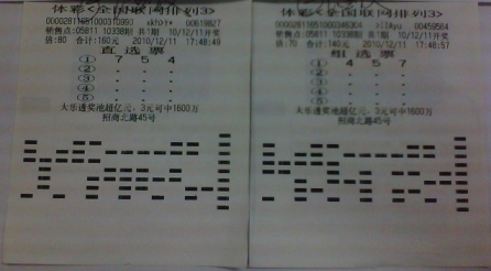 12月11日傍晚,林先生发出当天最后一批货后心情很不错,直接走进05811站点。他刚进站点,业主就热情地招呼他坐下,就号码走势给林先生简要分析了一下,并介绍非常看好当期和值“16”点。林先生以业主的推荐为依据,浏览了一下“排列3”走势图,针对10338期决定单挑“754”这组号码。林先生还是坚持自己一注直选和一注组选的投注方式,购买了直选“754”和组选“457”,并对直选票下了80倍、组选票下了70倍。