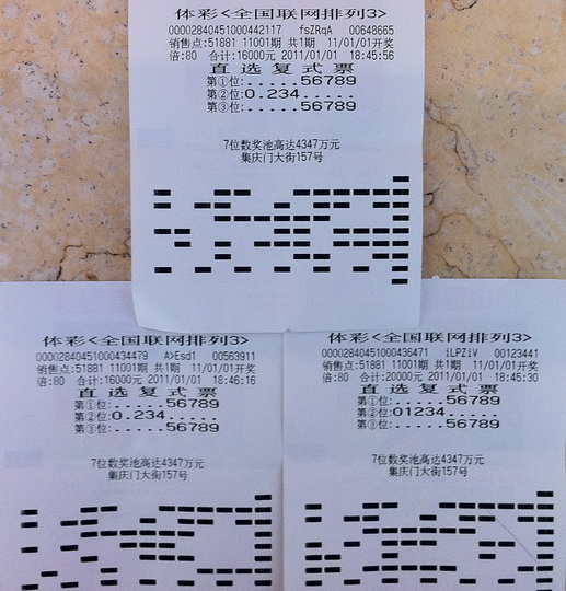 刘先生还举例说,元旦那天他看好了“大小大”的组合,就买了第一位和第三位为“5、6、7、8、9”,第二位为“0、1、2、3、4”的号码,倍投80倍。后来他转念一想,12月31日那天的中奖号码为“311”,出现了2个“1”,他就又将第二位上的“1”去掉,倍投了160倍。