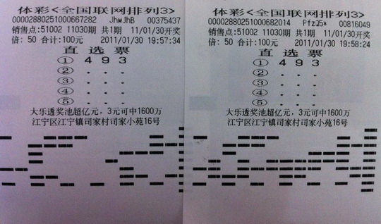 从他俩出示的中奖票来看,儿子小周(化名)一张彩票上只有“493”一注号码,倍投50倍,而母亲