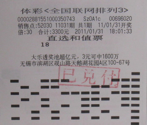 1月31日晚,体彩排列3第11031期开出号码“864”,无锡彩民张先生(化名)通过倍投和值“18”收获奖金3万元。