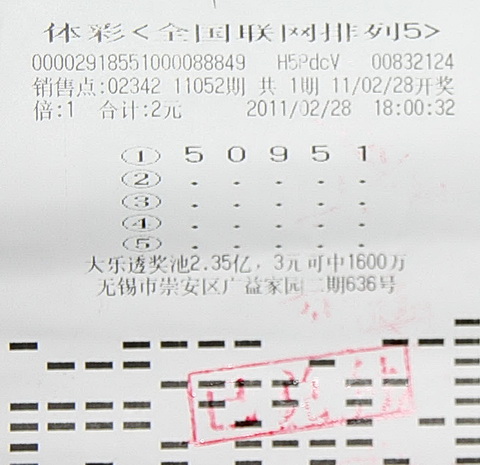 苏阿姨开心地自爆她的彩运很旺,经常有意外收获,至于怎么个旺法,苏阿姨不等我们细问就主动给我们讲起来。苏阿姨说,结识彩票是在多年前,那时在广场上销售即刮型的彩票,场面非常壮观,一天她抱着试试看的态度买了一张彩票,结果运气好的中得一辆摩托车。几年后她偶尔走进一家体彩销售网点,结识了电脑型的彩票,第一次买时自己不知怎么选号,就用那辆摩托车的牌号买了一注排列5“5 0 9 5