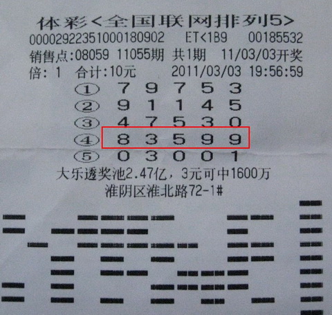 回到家后,刘大姐通过电视得知了排5的开奖结果:“8 3 5 9 9”。她拿出票一对,哇,中了!没想到10万就这样落在了自己头上,刘大姐激动了老半天。她说还会继续努力,争取中得百万大奖!(虎 啸)