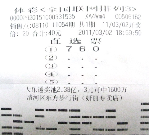 中奖的美女彩民张小姐(化名)就是本地人,她中得是排列3第11054期2万元。说起自己的购彩经历,张小姐还有点羞涩,她说自己是跟着朋友一起购买体彩的,起初看朋友买彩票时还有点犹豫,觉得中奖机会很渺茫,可是看着朋友时不时能中个小奖什么的,也想一试身手,于是就跟着身边的朋友开始购买。对于排列3,张小姐说数字少,中奖率高,挺适合自己购买的,她一般也就随机购买,有时也自己编个号,每次购买也就几十元。2日晚,张小姐下班以后和朋友一起来到了淮安市清河区东方步行街,逛着逛着张小姐看到了08110体彩站点。想想手上还有找剩下的40元零钱,要不买彩票吧,试试运气。于是张小姐让销售员随机打了一注排列3,然后倍投了20倍。拿着票,拎着“战利品”,张小姐和朋友一同开心离去。