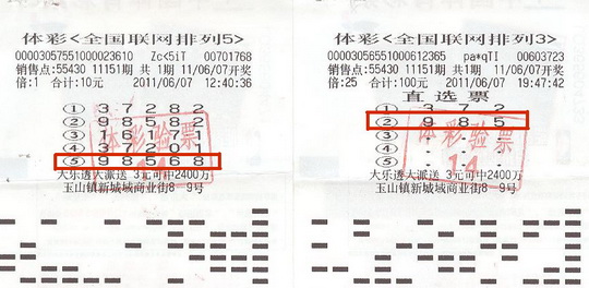 说着就递给工作人员两张彩票:一张是自选两个号码投注了25倍的“排列3”,其中一个号码“985”正是11151期“排列3”的中奖号码;另一张自选了5个号码,其中“98568”也正是11151期“排列5”的中奖号码,因此,在11151期排列型玩法中,小王总计中得奖金12.5万元。中出大奖的站点是位于玉山镇新城域商业街8-9号的55430站点。
