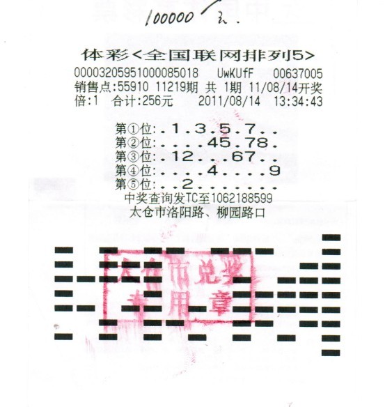 8 月 14 日 , 太仓 55910 站点中出“排列 5 ”直选大奖一注,一老彩民赢得 10 万元奖金!