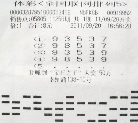 9月20日傍晚,正值饭店最忙碌的时间,外面还下着零星小雨,可钱女士丈夫还没投注当期的彩票,心里就没底儿,他毅然跑去了不远处的李闸路05805彩票站点。当期,他将第一、三、四位看得极准,分别是9、5、3;对于其余两位开始挺犹豫的,思虑良久,决定第二位选择3或8,最后一位选7或9较合适。因此对11256期“排列5”投注了一张4注号码的单式票,仅花费了8元。