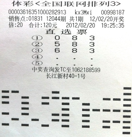 之后,这位彩民一边走一边还在想排列3的投注号码,觉得583这个号码也不错,所以路过黑龙江路16号-9的01828体彩站点时,和之前两个号码一起倍投了25倍。“看着这三个号码,我又觉得感觉不错,所以回家时候路过01831体彩站点又倍投了20倍。”