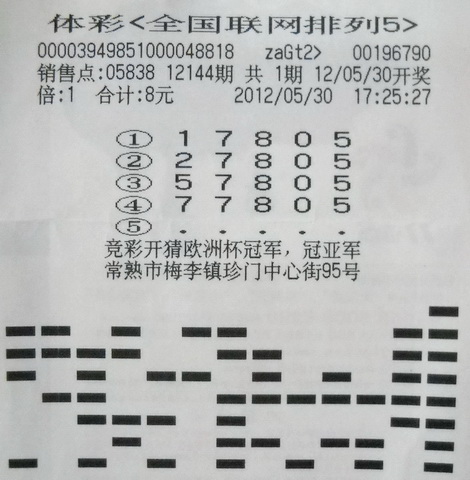 5月31日,吃完午餐的常先生向着05838彩票店走去,老远就看见站点悬挂的中奖横幅,鞭炮燃放的气味弥漫在整条街道,还未散去。只听销售员介绍说,店里有个彩民中了1注排列5十万,号码是2 7 8 0 5。“这不正是我买的号码嘛。”说罢,常先生迫不及待地向体彩中心赶去,跑了几步又折回去,心想:还中了排列3呢,先把1000元的直选奖金兑了。