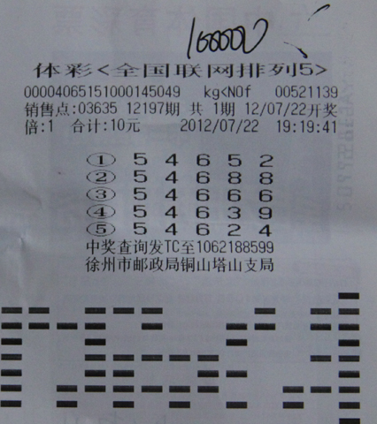 “排列5” 第12197期开奖号码为:5、4、6、6、6,徐州03635站点彩民老杨再次中得奖金10万元!