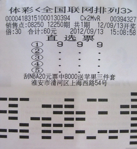 9月13日晚开奖的体彩排列3第12250期开奖号码为“9 9 9”,淮安小伙小金中得奖金90000元。