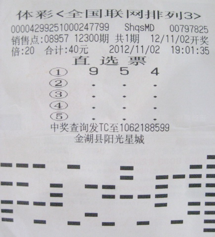 11月2日晚,李先生来到位于金湖县阳光星城的08957站点,他先买了一张大乐透,然后就让销售员打了一张20倍的“9 5 4”排3直选票。这是李先生守了一段时间的号码,因为是自己选的号,所以他每期都买。俗话说的好:“坚持就是胜利”,正是李先生的坚持,让他中了奖。李先生说,“以后还得坚持买,将中奖进行到底。”(陈啸)