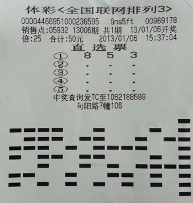 新年伊始,太仓体彩喜讯连连。2013年1月6日晚上,“排列3”第13006期开出中奖号码“8、5、3”。太仓市城厢镇05932销售站点传来喜讯,该站点彩民陈先生(化姓)独中排列3直选25注,收获奖金25000元。