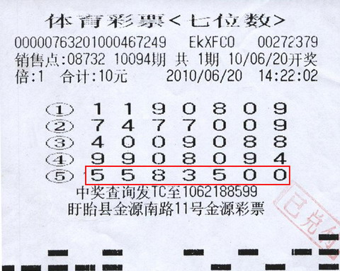 据了解,小马今年二十多岁,买彩票的时间并不长,喜欢自编号码投注。仔细看一下小马的这张10元的中奖彩票,可以发现有一个很大的特点,那就是每注号码中都有2到3个数字重复出现,有几组号码中同一个数字甚至出现3次之多,如第2注号码中的“7”、第3注号码中的“0”、第4注号码中的“9”和第5注号码中的“5”都出现了3次,据小马透露,这正是他购买7位数的“绝招”,他笑着告诉我们,一般人购买7位数如果是自选号码肯定不会选这么多重号,而如果是随机选出这种号码很多人也会直接重选,但实际上被大多数人认为不可能的事情往往很有可能发生,他就是看准了这点,采取了这种特殊的选号方式投注7位数。