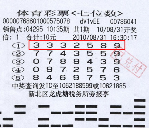 老刘实际上是个老彩民了,有事没事总要打上几注体育彩票,虽然没中过什么大奖,倒也不介意。买彩那天,老刘和几位老友约好在家里打麻将,最后老刘赢了10块钱,几位老哥们起哄让他请客。赢了钱不管多少总是让人开心的,老刘就哧溜下了楼,但他并没有去买什么酒菜,而是一猫腰钻进了自己经常去的体彩点,就用这牌桌上赢的10块钱随机打了5注7位数彩票,然后再去张罗几位老友的饭菜。运气来了真是挡也挡不住,当晚,7位数10135期开奖,这张彩票的第1注号码“3332589”正是当期的中奖号码,奖金达到466万元。