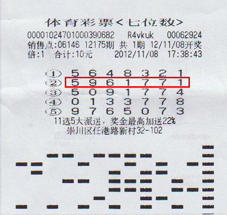 再关注一下老陈的这张中奖票,是一张再普通不过10元5注的7位数彩票。第2注号码“5 9 6 1 7 7 1”正是当期的中奖号码,奖金为500万元。不过第3注号码“5091774”虽然只中了20元,但非常神似中奖号,而第4注号码也中了5块钱,但也有点类似中奖号。随机号中奖并不稀奇,但几个号码类似还是挺罕见。老陈则笑呵呵地给出了答案,原来老陈是位技术型彩民,这是精心编制的一组彩号。“以前我还有一次和大奖擦身而过啊,只是中间的号码错了,像这种20块、5块的小奖我可是经常中,300块也中过好几回,几千块的我也中过……”谈起彩票,老陈非常的健谈。(苏彩)