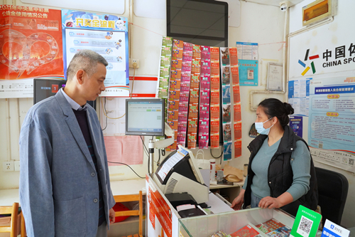 在便民服务店,中心主任仔细察看了店内配备的便民服务设施,向销售员了解便民设施的使用情况,鼓励网点结合自身实际和群众需求进一步丰富网点服务内涵,把网点转化为凝聚爱心、温暖民心的场所,彰显体彩公益责任形象。