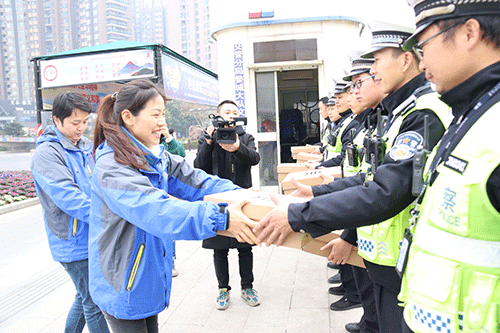 1月3日,金华体彩开展“冬日送温暖”活动,全体工作人员到全市各大路口慰问交警、环卫工人,为交通道路上的守护者们送去冬日里的温暖。