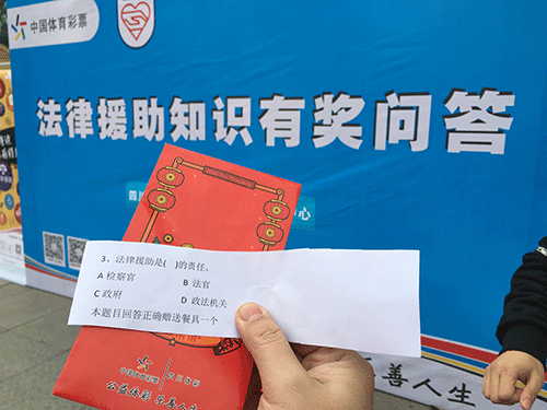 南充体彩在现场准备了别致的“红包”和精美的小礼品,“红包”里面装的是一个个法律援助问题,只要拆开“红包”,正确回答里面的问题,即可获赠精美小礼品一份。这一暖心举动引起了农民工朋友积极参与的兴趣,现场气氛十分热烈。
