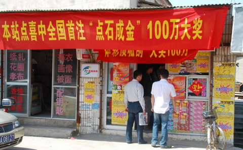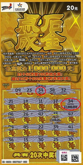全国第一注顶呱刮100万大奖诞生于2009年,中奖地位于南京东郊的沧波门59号的01297体彩销售点。中奖的小伙子是附近驻扎的武警战士,是站点的老顾客。据悉,去年的 5月5日上午10点多,这位武警战士照常来买彩票,站点销售员老王向他推荐了刚上市不久的“点石成金”。买了几张后,小伙子就伏在旁边桌上刮了起来。前面几张中出了几十块钱的小奖,在第6张刮到第二行时,小伙子愣住了,然后把票拿给老王看,问是否中了10万的大奖。老王一看也愣住了,彩票上与第一栏中奖号码“34”相同的数字下面,赫然列着“1000000”。有趣的是这个武警战士很是大方,兑奖前答应了记者采访,等兑奖时看到成群的记者拿着摄像机、照相机一时慌了神,一溜烟从兑奖大厅里跑了出去,再也不见踪迹。