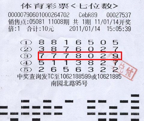 小陈是从11007期开始购买7位数的,11008期只是他第二次购买,既然是新手,自然也没什么技巧可言,不过就是花了10元钱请销售员随机选号,没想到一下子就“撞到了”大奖。为他赢回巨奖的号码是当期他所购买的第3注号码“7778029”,小陈表示以后除了这注已经中奖的号码,当期他所购买的彩票上的另4注号码他将拿来守号,因为他觉得这几组号码能被他选中就是一种缘分。