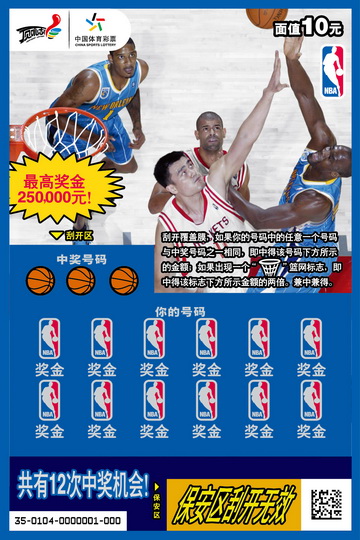 此次在我省首先上市的为10元面值的票,票面为深受人们喜爱的NBA顶级明星球员,其中印有姚明形象的票面格外亮眼,而要赢取最高25万元的头奖,方法也非常简单:刮开票面“NBA”标志的覆盖膜,如果你的号码中的任意一个号码,和篮球标志下的“中奖号码”之一相同,即可中得该号码下方所示的金额;如果出现一个篮网标志,即中得该标志下方所示金额的两倍,兼中兼得。