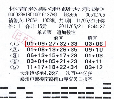 虽然每次都是随机投注,但刘先生绝对是“粗中有细”,自打大乐透在5月份进入派送期之后,他都很自觉的开始实施追加投注。“既然加奖和奖池都那么高,追加一下哪怕中个小奖也有不少实惠呀。”刘先生如此解释道。好运来了真是挡也挡不住,在大乐透的11058期,他投出的第一注号码“01 09 27 32 33+03 06”正是当期的中奖号,更为幸运的是由于采用追加,他还多分得309万元,总奖金达到826万元!