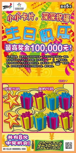 刮奖区的设计也很独特,是由8个色彩不一的生日礼盒组成覆盖膜。刮开覆盖膜,你的号码中的任意一个号码和中奖号码之一相同,即中得该号码下方所示的金额;如果出现一个蜡烛标志,即中得该标志下方所示金额的五倍;如果出现一个蛋糕标志,即中得该标志下方所示金额的十倍;兼中兼得。打开这张折叠彩票,即可看到彩票的背面,其中一面是通常的购票须知,另一面则是填写贺卡祝福语的地方。所以除了正常的刮奖功能之外,“生日快乐”这款票完全可以作为生日贺卡使用。据悉,该票面值5元,共有8次中奖机会,最高奖可达10万。(郑俊春)