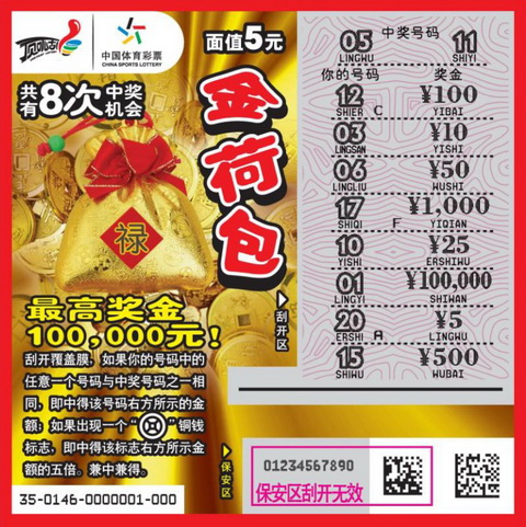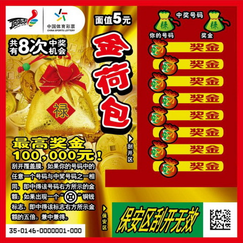 “金荷包”是一款5元票种,最高奖金10万元。它的游戏规则十分简单:刮开覆盖膜,如果你的号码中的任意一个号码与中奖号码之一相同,即中得该号码右方所示的金额;如果出现一个“铜钱”标志,即中得该标志右方所示金额的五倍。兼中兼得。
