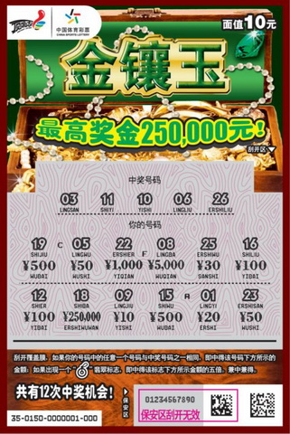 体彩即开“珠光宝气”系列一直就十分吸引眼球,此次推出的新票“金镶玉”可谓华丽十足,票面上衬托着翡翠、珠宝等元素,刮奖区由类似08奥运金牌“金镶玉”标志覆盖,玩法规则与“金荷包”十分相似:刮开覆盖膜,如果你的号码中的任意一个号码与中奖号码之一相同,即中得该号码下方所示的金额;如果出现一个翡翠标志,即中得该标志下方所示金额的五倍。该票共12次中奖机会,兼中兼得。