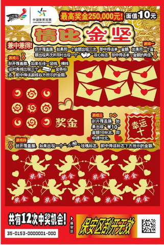 “情比金坚”的票面充满了暖暖的爱意,“丘比特爱神之箭”、“浓浓心意情书”等元素成为票面的主旋律,同时,此款票的游戏也十分丰富有趣,其中游戏一为寻找相同金额:如果同一个金额出现三次,即中得该单一金额;如果同一个金额出现两次并同时出现一个“双心”标志,即中得该单一金额的两倍。游戏二则类似于Bingo游戏:刮开覆盖膜,如果在任一竖线、横线或对角线出现三个“金条”标志,即中得该游戏右方所示的金额。游戏三为“幸运十”:如果出现“¥10”标志,即中得 10 元。游戏四则充满了浪漫气息,在爱神丘比特的身后藏着玫瑰花,如果你能找到,即可中得下方金额。