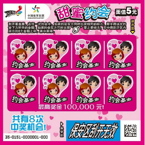 体彩顶呱刮送“约会基金”啦!这款“甜蜜约会”共有8次冲击10万元“约会基金”的机会。只要在任何一次“约会”中,约会双方出现相同的标志,即中得该次约会下方所示的金额;如果约会双方同时出现“爱之箭”标志,即中得刮开区内所示的 8 个金额之和,兼中兼得。